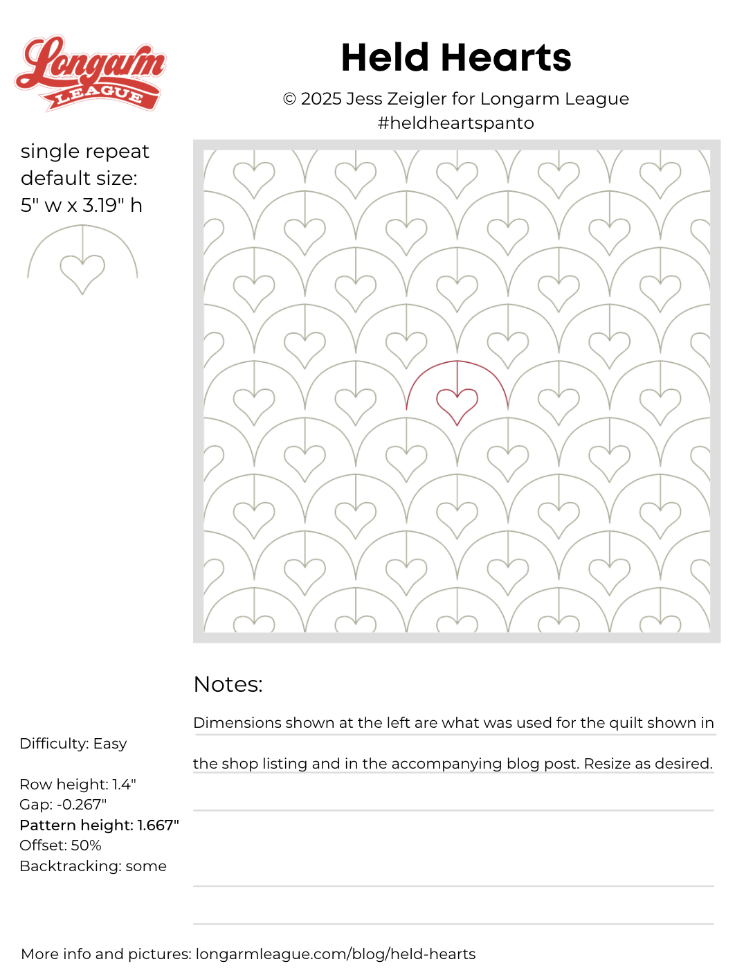 This quilt is fairly small, so I scaled the pantograph design down from the default size. As stitched, each individual heart is just shy of 1" tall.